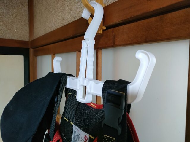 ライフジャケットを車のアシストグリップにかける際、普通のプラハンガーだと折れやすいし、針金ハンガーだとかけた瞬間に伸びて落下・・・。